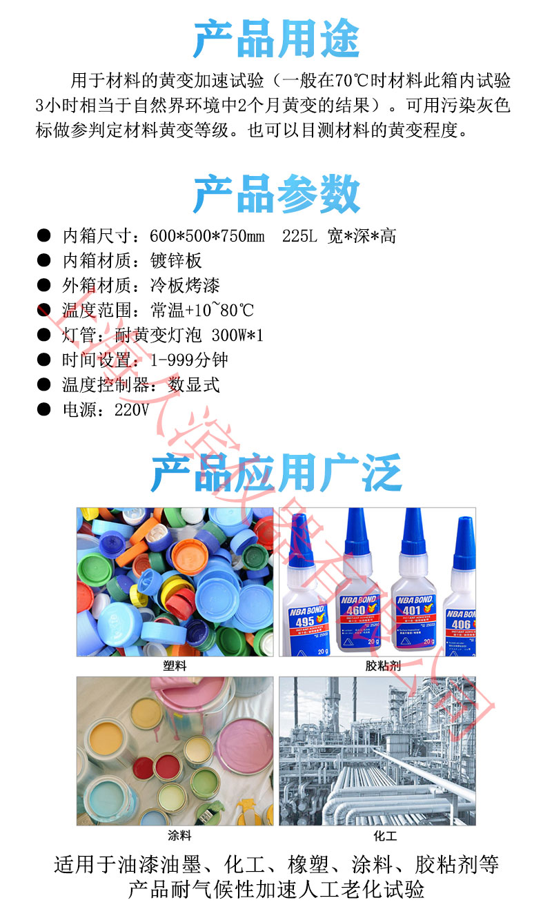 耐黃變照射試驗箱適用于陽光的紫外線輻照及熱度,試樣于機臺內(nèi)經(jīng)紫外線照射與溫度作用,經(jīng)過一段時間后,觀察試樣變的程度,可用染污灰色標(biāo)作參考。